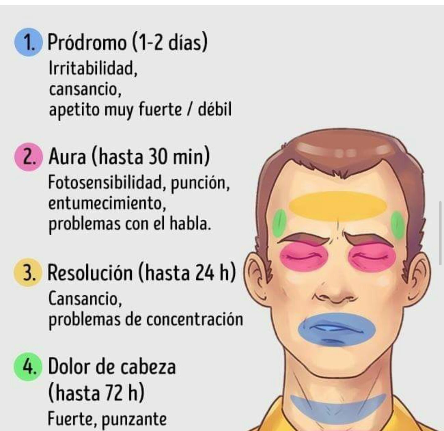 Todos los síntomas de migraña aparecen durante el ataque que tiene 4 fases, aunque no todas de ellas pueden ser marcadas completamente.